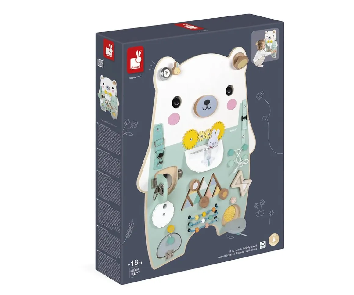 Este adorable osito interactivo de Janod, esconde más de 20 actividades sensoriales y de motricidad para descubrir. Con texturas, sonidos, cierres, engranajes, laberintos y mucho más, invita a tu peque a explorar, manipular y aprender mientras se divierte ¡Horas de descubrimientos y diversión aseguradas!