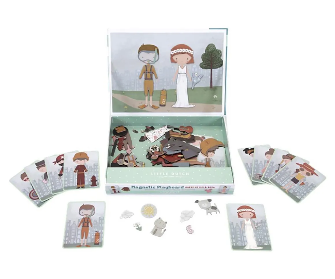¡Juega a disfrazarte con Jim & Rosa! Con este puzzle magnético puedes copiar los atuendos de las cartas en el tablero con piezas magnéticas. O usar tu propia imaginación. Hay un sinfín de combinaciones que garantizan mucha diversión mientras fomentan el vocabulario y la coordinación. Es perfecto para jugar en casa, pero también de viaje.