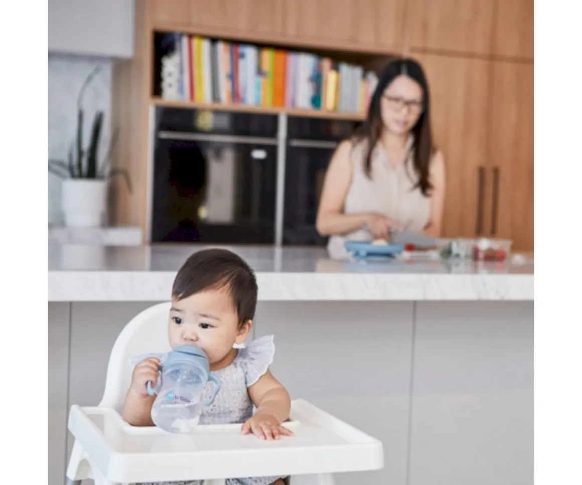 Es evolutiva ya que se puede intercambiar con la tapa de la taza con boquilla blanda y la taza con borde de entrenamiento que puedes encontrar