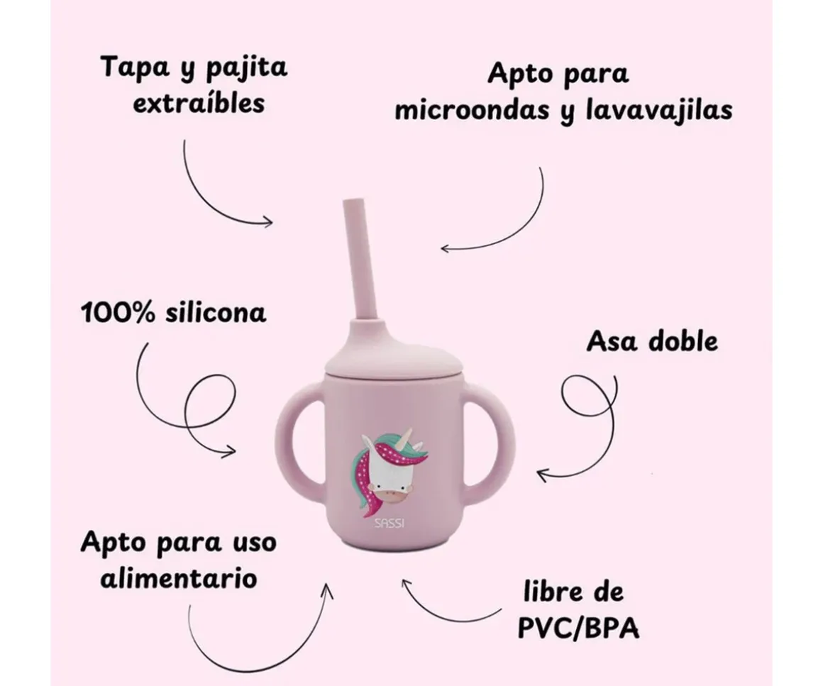 Comenzar a beber de forma independiente será muy divertido y seguro con la taza de silicona con asas y pajita de Sassi.
