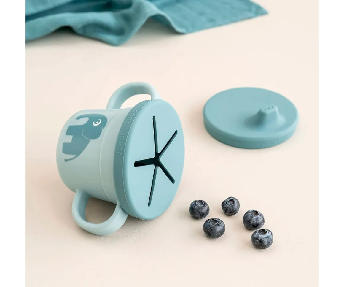 La tapa de los snacks los mantiene en el interior y es perfecto para llevar a cualquier lugar. La tapa con la boquilla es a prueba de derrames y una vez que su hijo esté listo, podrá usar la taza sin tapa. Las dos asas proporcionan un agarre firme.