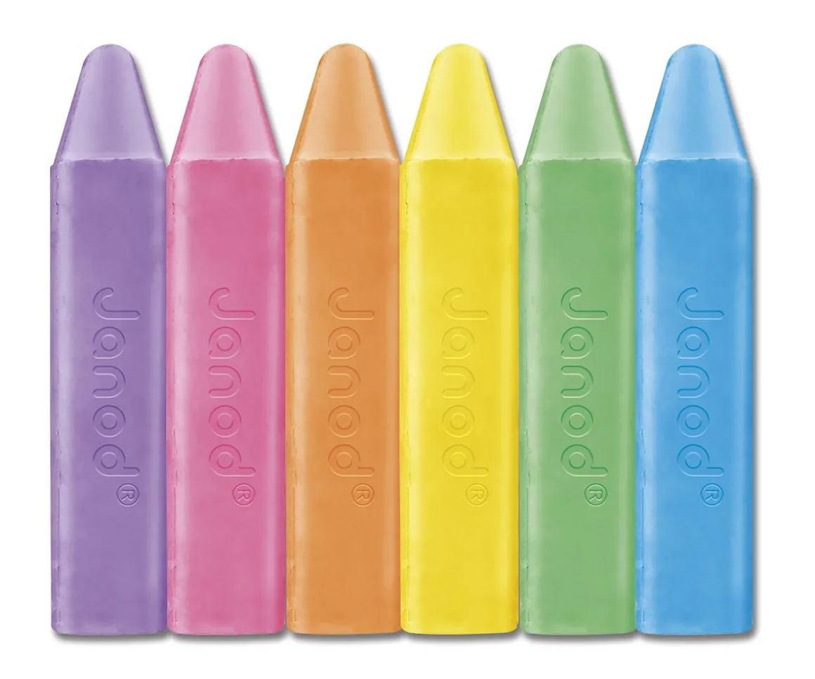 Set de 6 tizas grandes de colores Janod, perfectas para dibujar en el suelo o en pizarra. Su formato cuadrado facilita el agarre y su limpieza es muy sencilla: se eliminan con agua.
