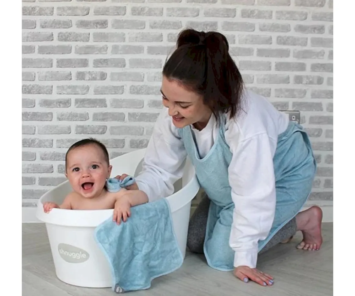 La toalla delantal de bebé de Shnuggle te mantiene seco y tus manos libres para que la hora del baño sea cómoda y sin estrés. Su diseño te permite tener ambas manos libres para levantar al bebé del baño y envolverlo en la toalla con facilidad y evitar mojarte mientras bañas a tu peque.