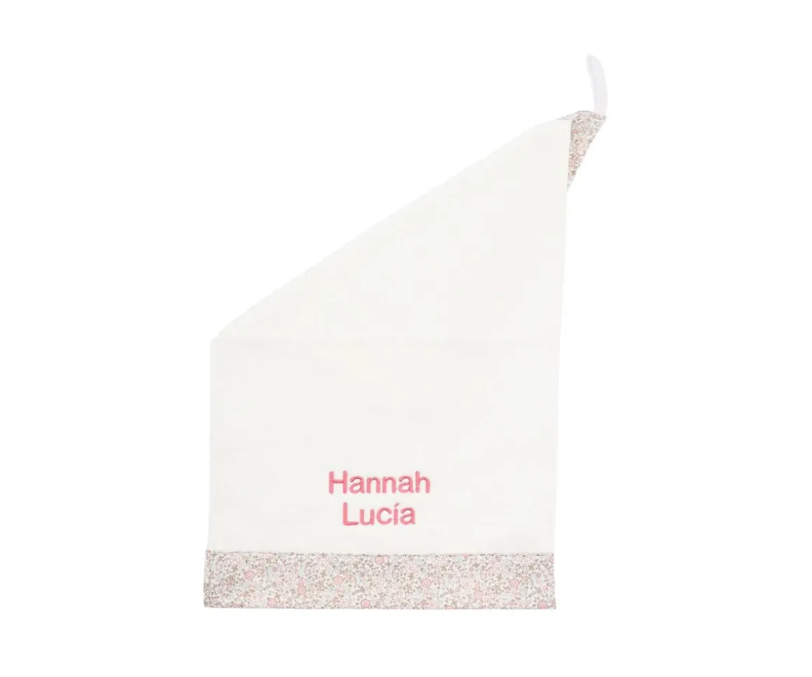 Es muy elegante y puede personalizarse en la parte central justo encima del ribete. Quedándo el nombre del peque perfectamente combinado con el color del dibujo.