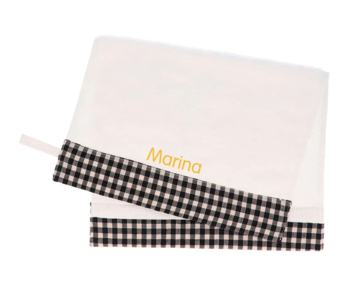 Es muy elegante y puede personalizarse en la parte central justo encima del ribete. Quedándo el nombre del peque perfectamente combinado con el color del dibujo.