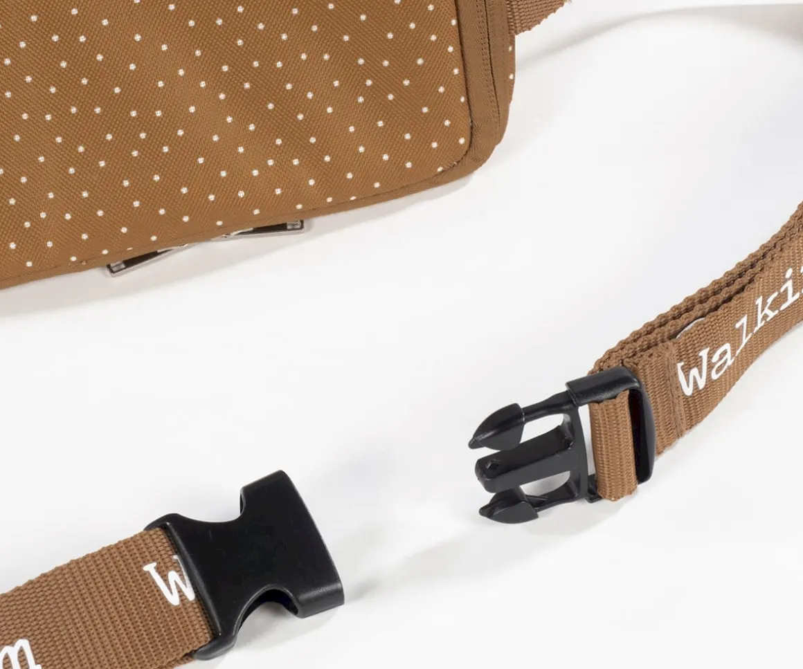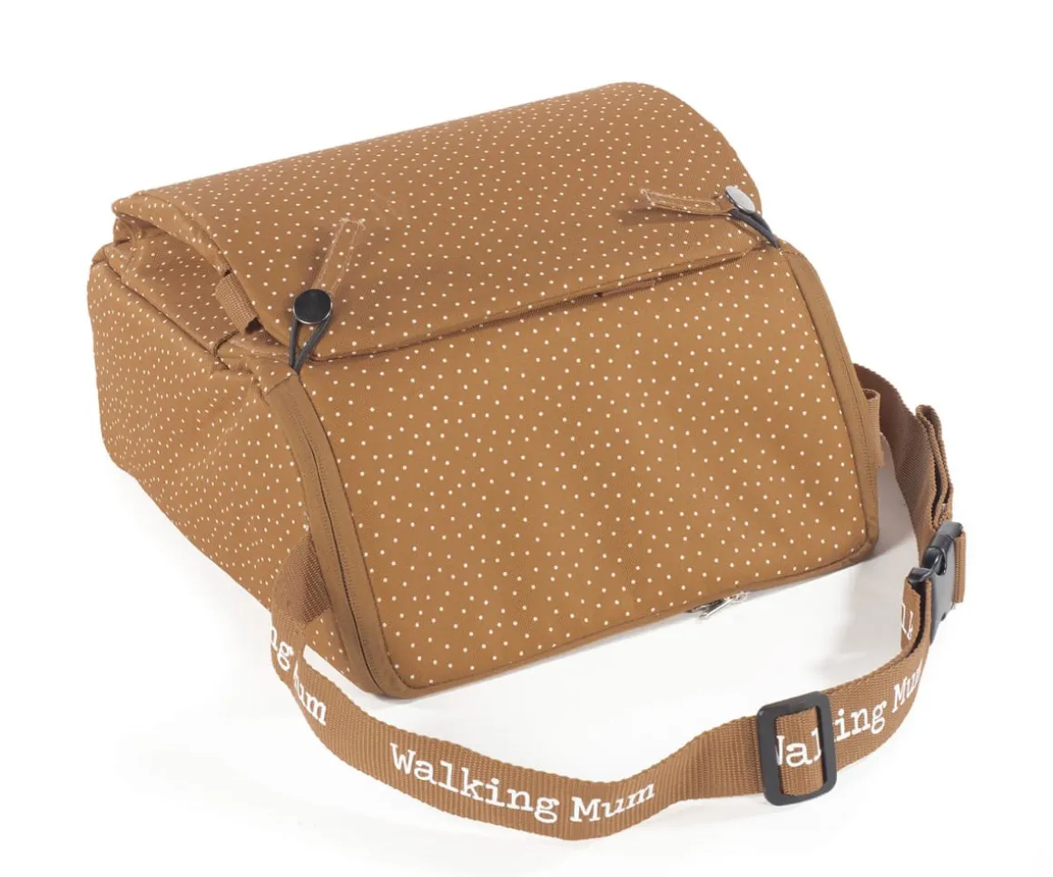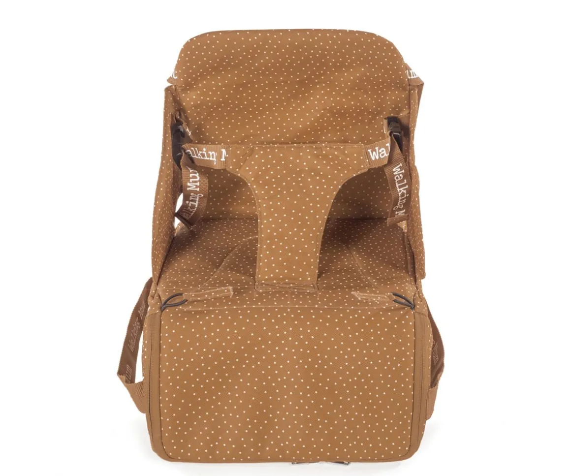 Trona portátil de la colección Lunares Poppy Canela de Walking Mum con función 2 en 1: asiento elevador y bolsa de almacenaje con asa para colgar del hombro.