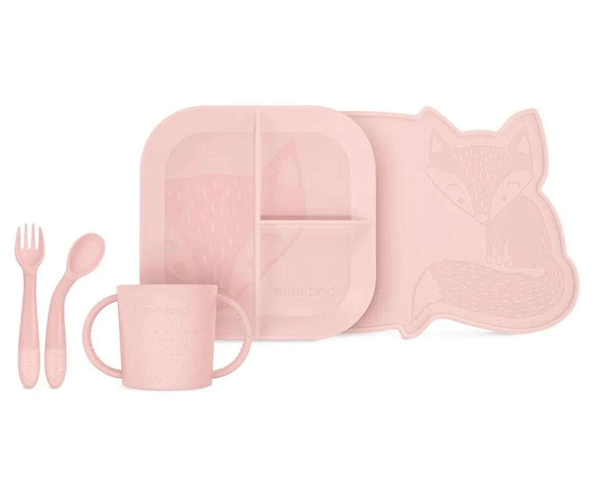 Este original set de vajilla contiene cubiertos flexibles y funcionales para que los peques puedan usarlos de foma sencilla, un vaso adaptado para que los peques puedan agarrarlo con facilidad ,un mantel y un plato con tres separaciones.