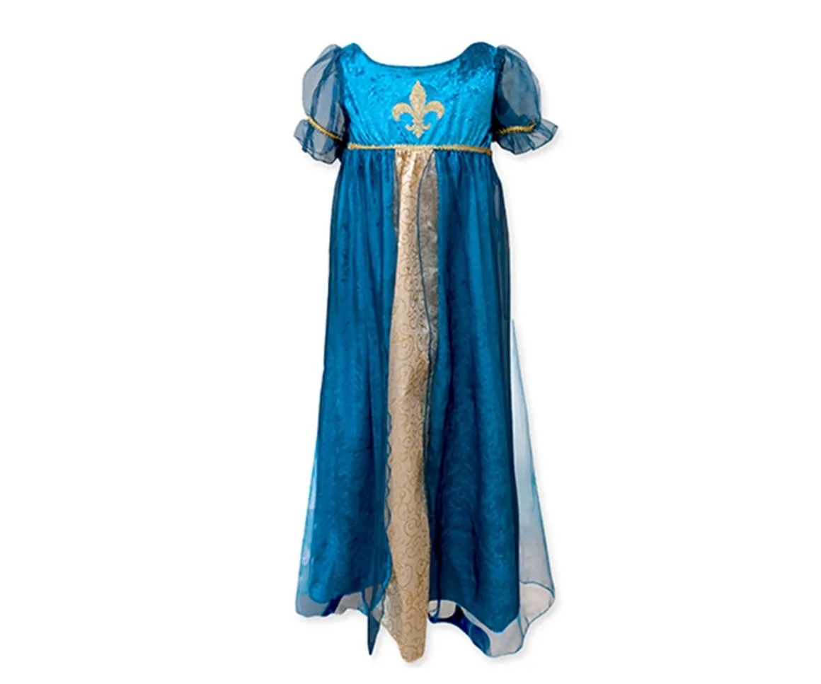 El precioso vestido Tudor de Great Pretenders está fabricado en tela aterciopelada ajustable, en una sola pieza formada por un cuerpo superior ajustable y una falda larga fluida con detalles de tul y bordados en dorado brillante. Las mangas son cortas de tul y con acabados dorados.