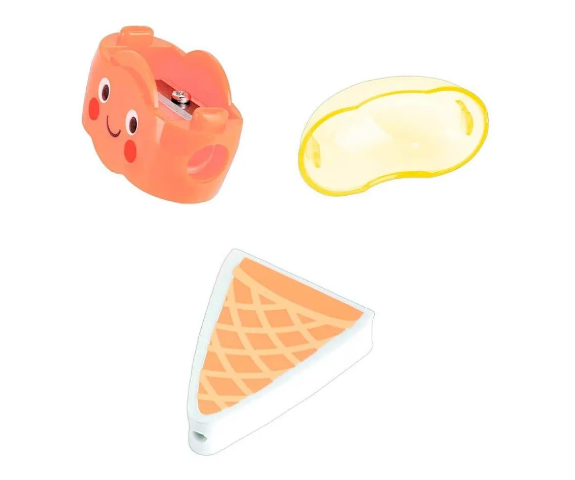Original sacapuntas con forma de helado con goma extraíble. Será el complemento que no podrá faltar en ningún estuche escolar.