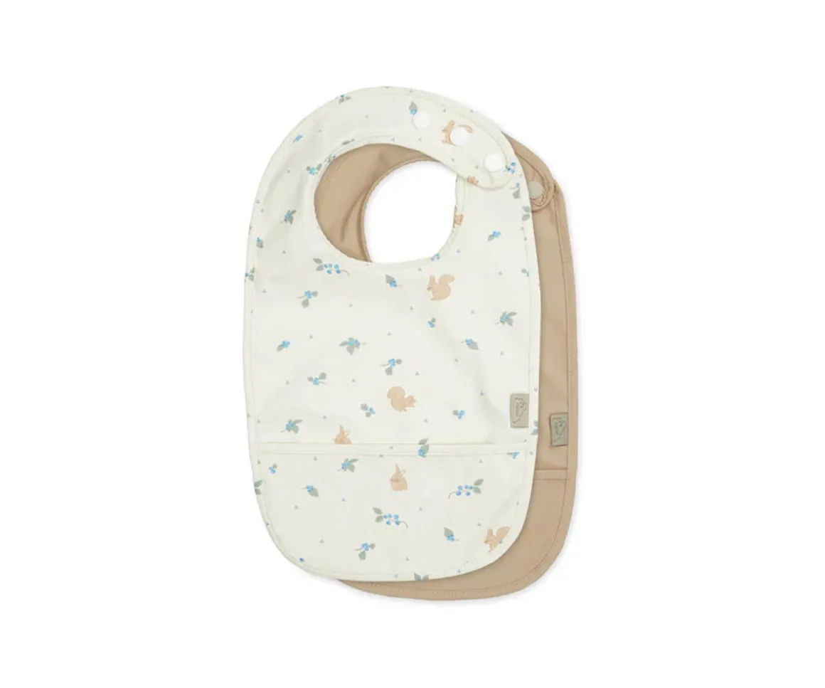 Facilita las comidas de tu bebé con este set de dos baberos lavables con bolsillor recogemigas en la parte delantera y que se ajustan cómodamente gracias a su dos cierres de polleras en su parte posterior. Son impermeables y encontrarás un diseño estampado y otro liso.