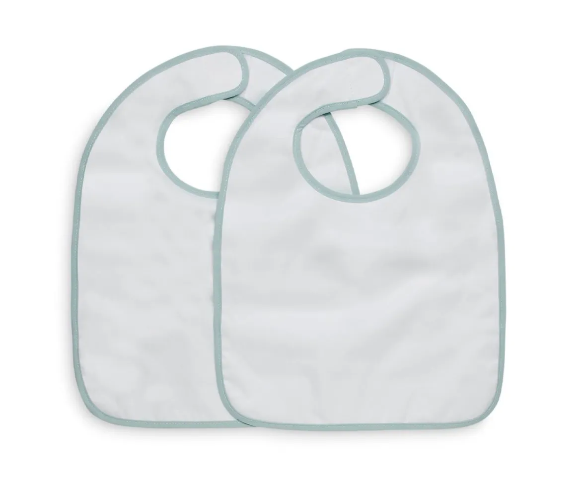 Set de 2 baberos con bolsillo recogemigas en la parte delantera hechos de poliéster que se ajustan cómodamente al cuello mediante velcro en la parte posterior.