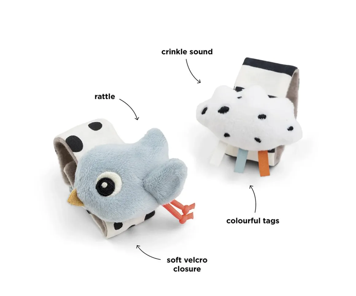 Un pulsera está decorada con lunares y el dulce pajarito Birdee azul, la otra con rayas y una suave nube de lunares y cintas que estimularán el tacto del peque. Ambas se cierran con velcro para poder colocarlas en muñecas o tobillos.