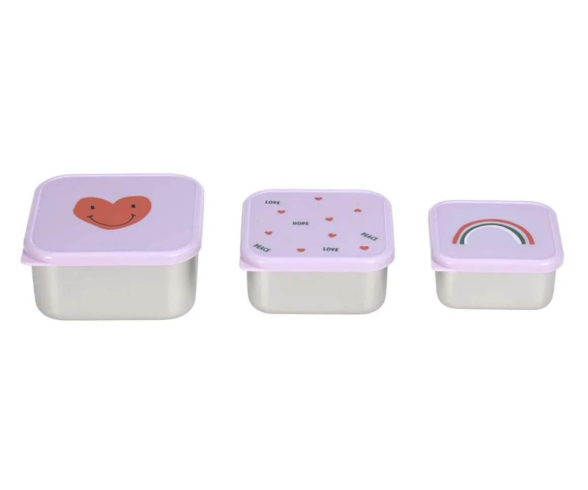 Set de 3 cajas de almuerzo de la colección Happy Heart Lavender de Lassig, para llevar pequeños snack al cole. Además se pueden apilar una dentro de otra, cuando no estén en uso, y ahorrar espacio.
