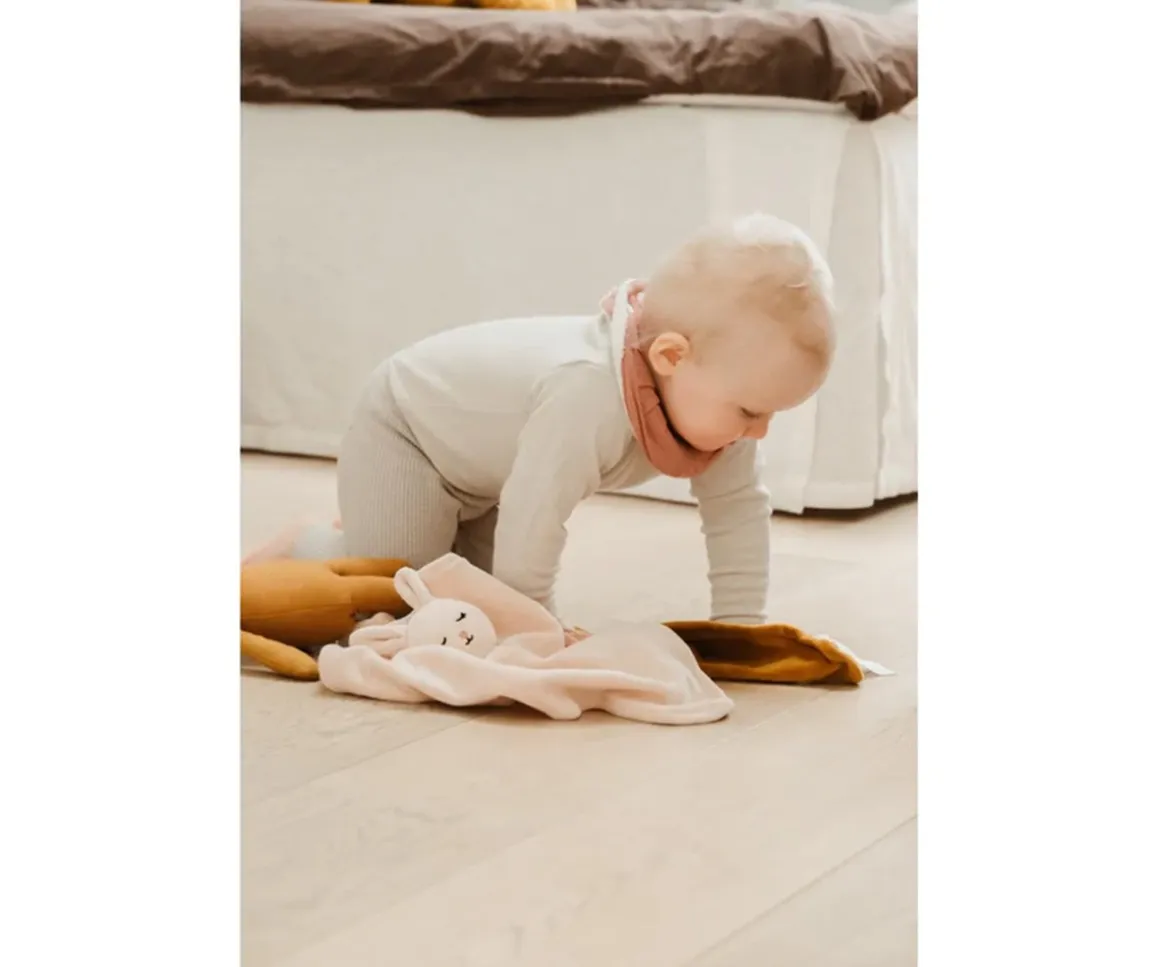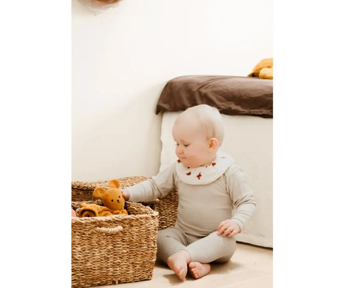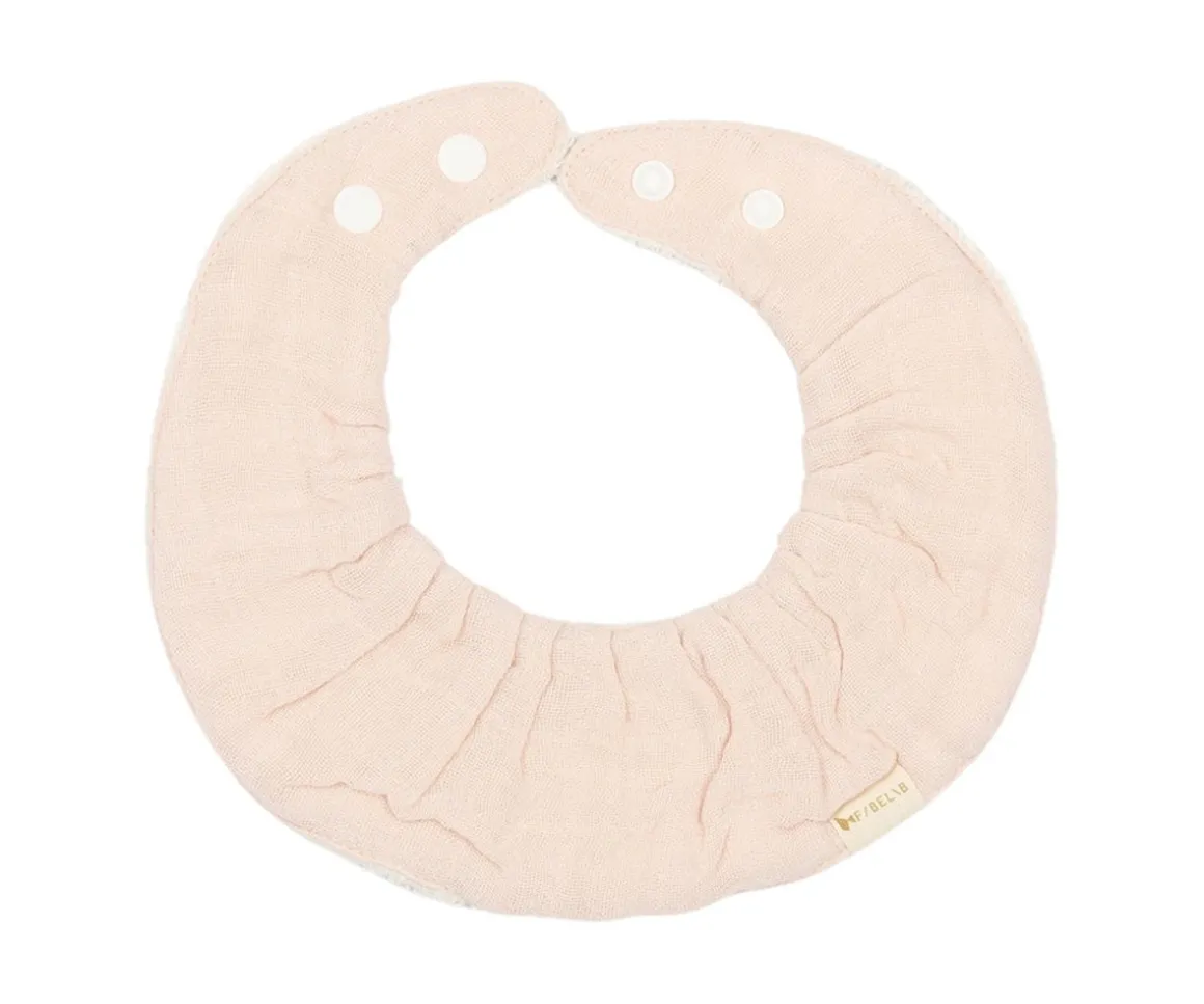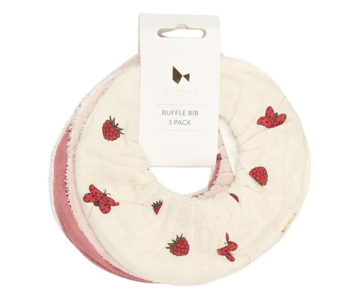 Secababitas con volantes fabricados en muselina de algodón orgánico, perfectos cuando tu bebé comienza con el proceso de dentición.