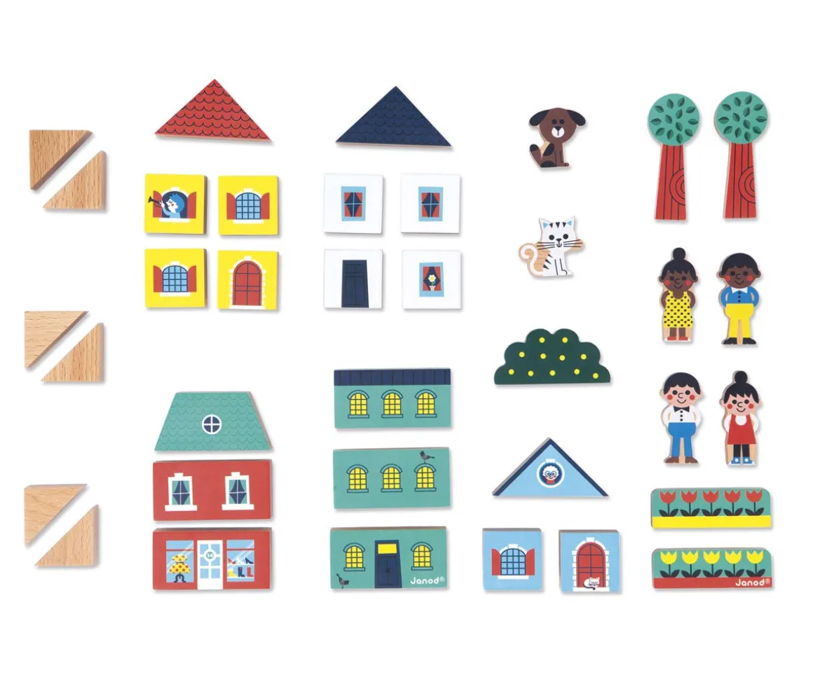Se trata de 36 bloques de madera con diferentes formas y decoraciones pintadas entre los que encontrarás 25 bloques para construir casitas, 5 elementos de decoración y 6 personajes
