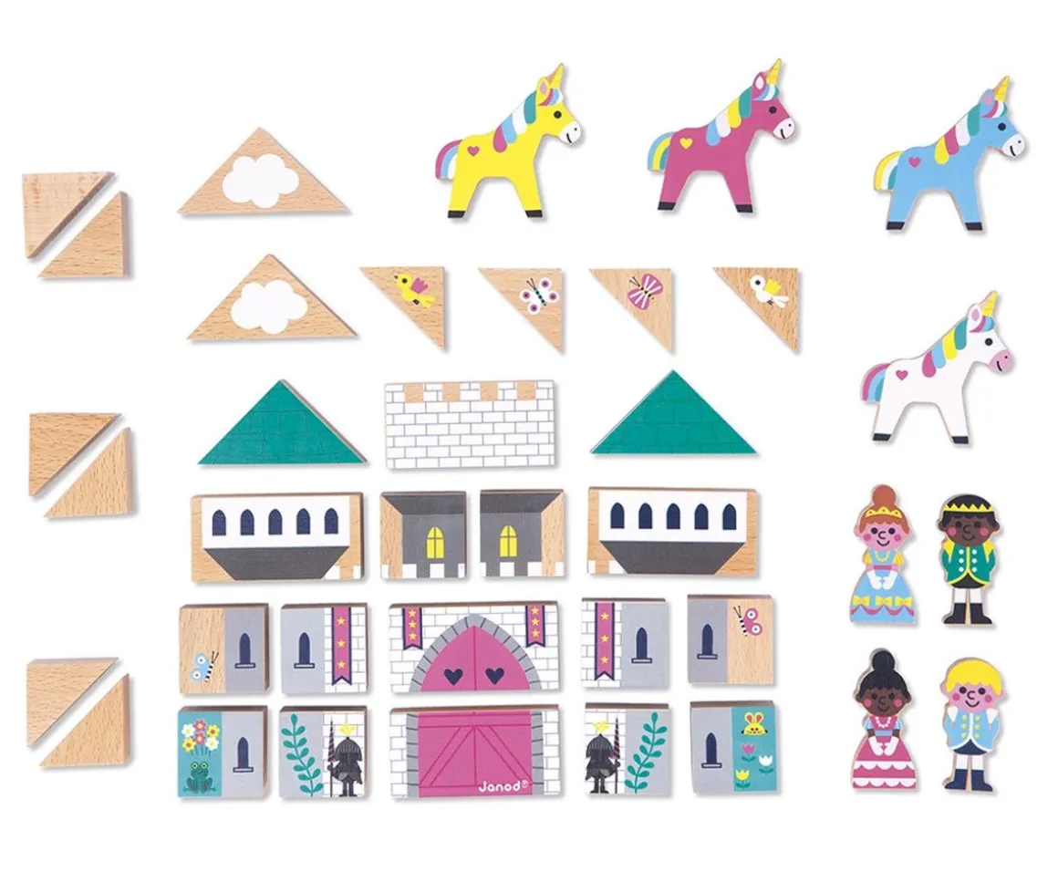 Se trata de 37 bloques de madera con diferentes formas y decoraciones pintadas entre los que encontrarás 29 cubos para montar un castillo y decorar sus alrededores, 4 personajes y 4 unicornios.