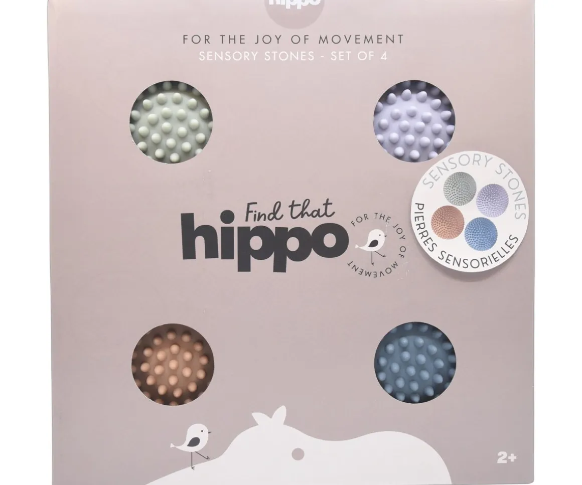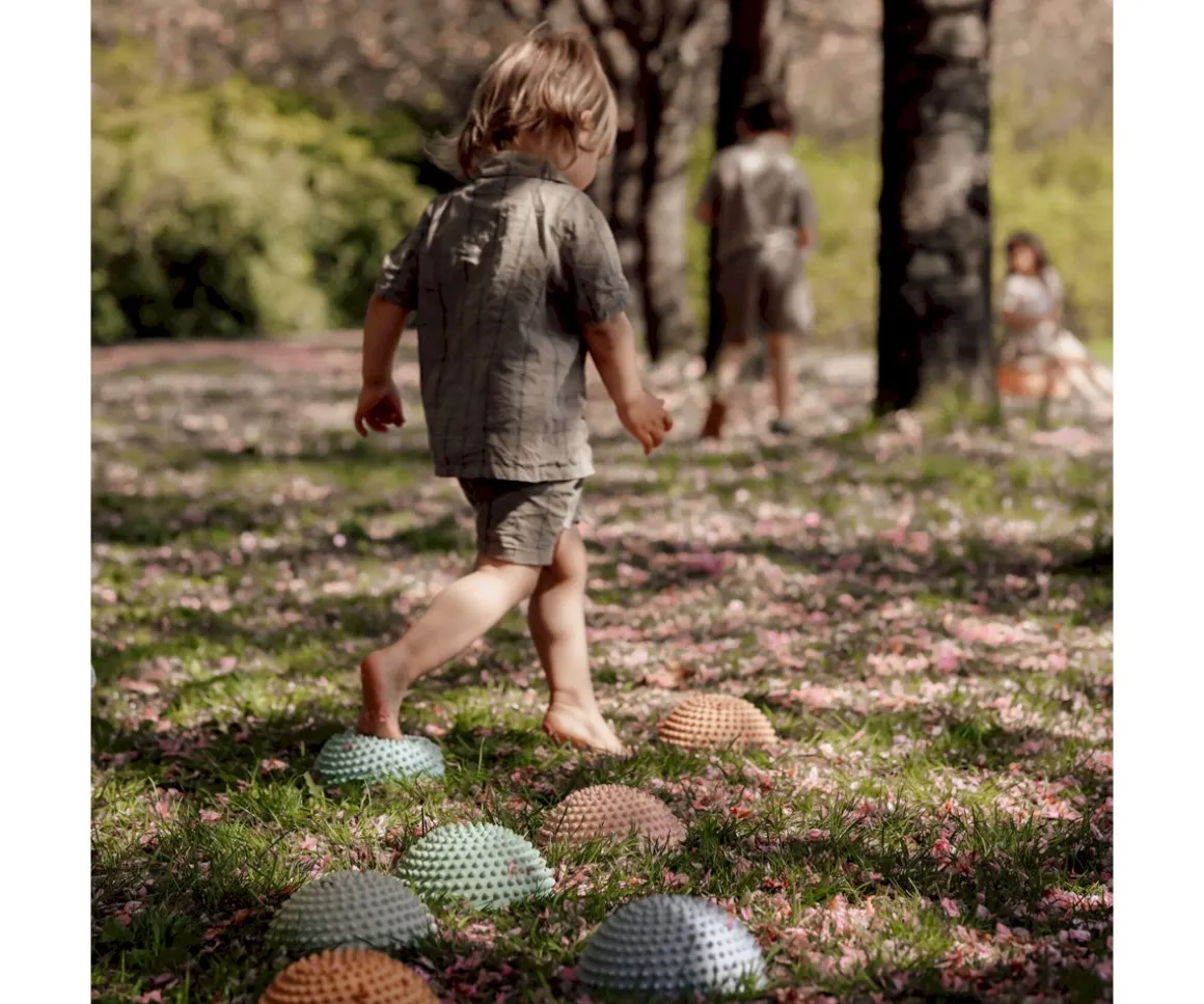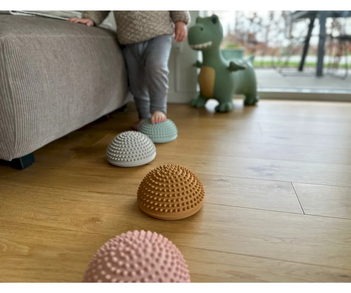 4 piedras sensoriales con base plana y superficie redondeada con dientecitos que mejoran la estabilidad, estimulan el sentido del equilibrio y potencian el desarrollo sensorial.