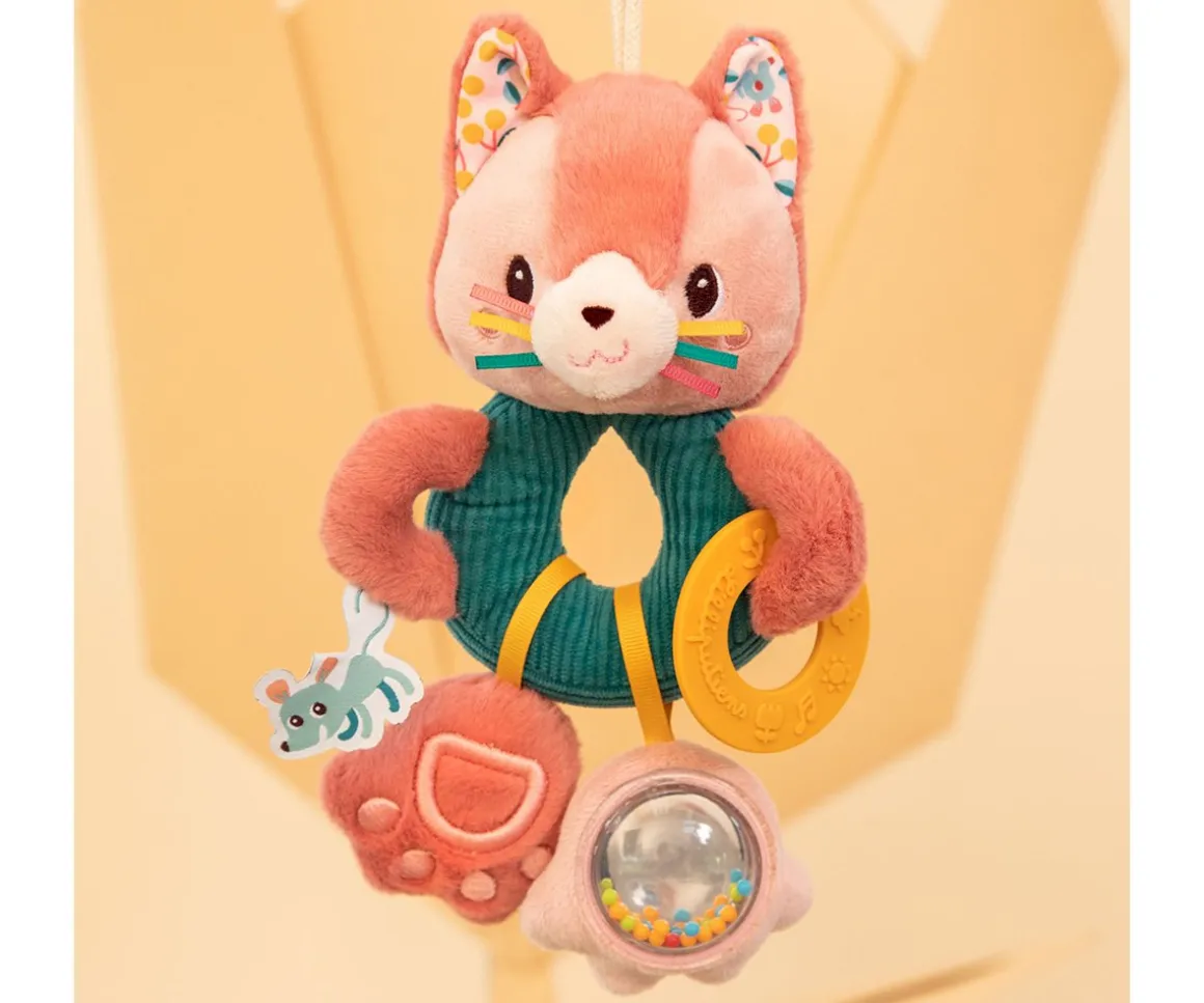 Este sonajero fácil de agarrar por las manitas pequeñas, estimula los sentidos del bebé con sus colores, sonidos y texturas. El gatito Jeanne ayuda a desarrollar las habilidades motoras y cognitivas del bebé además de entretenerlo.