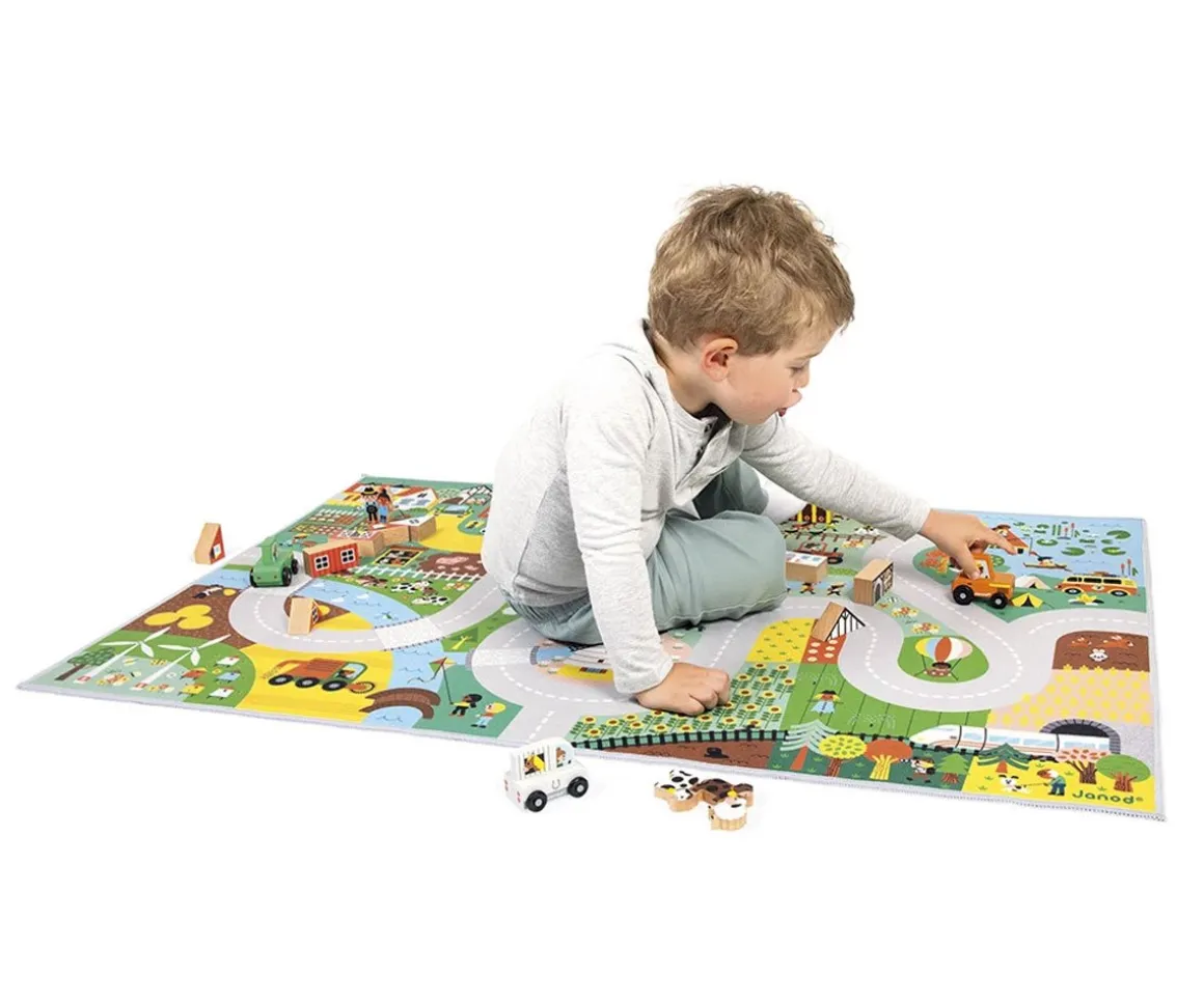 Las alfombras de juegos con circuito de la colección Cross Roads de Janod están repletas de carreteras, elementos divertidos como animales, casas y mucho más.