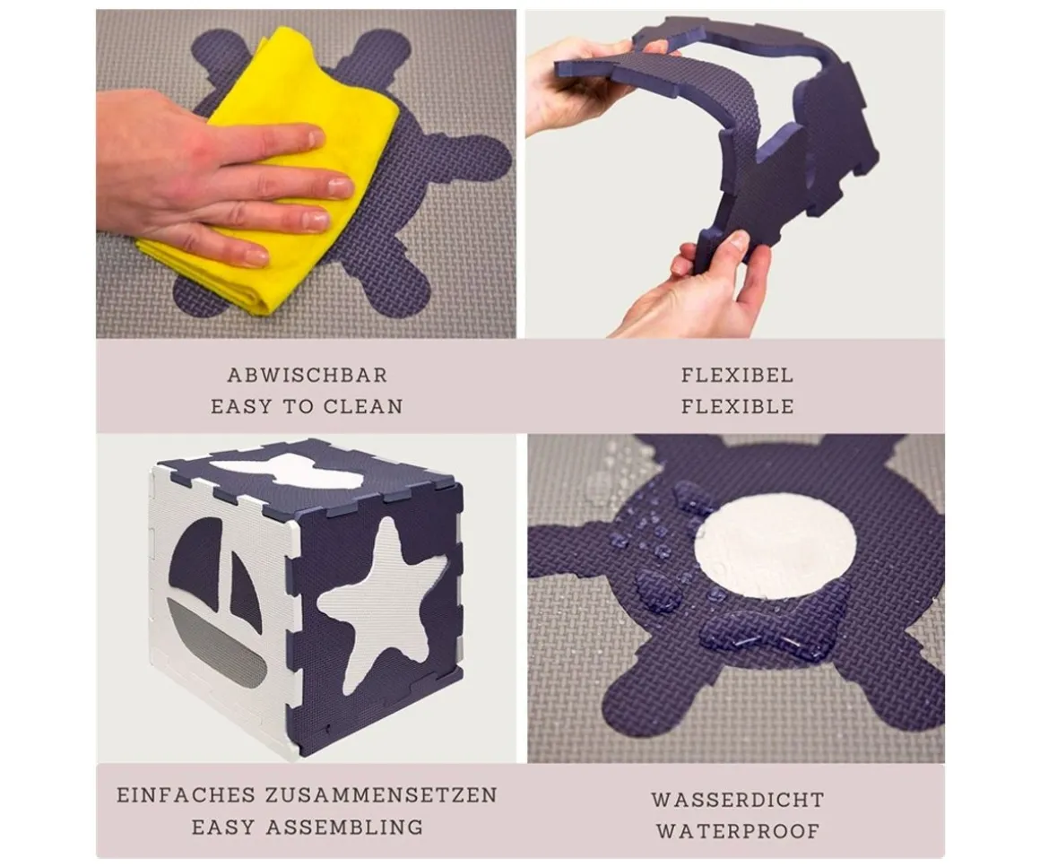 La alfombra de foam está formada por 12 cuadrados y 14 piezas de borde, perfecta para que los bebés puedan gatear, los peques jugar e incluso hacer ejercicio, ya que podrás usarla también al aire libre.
