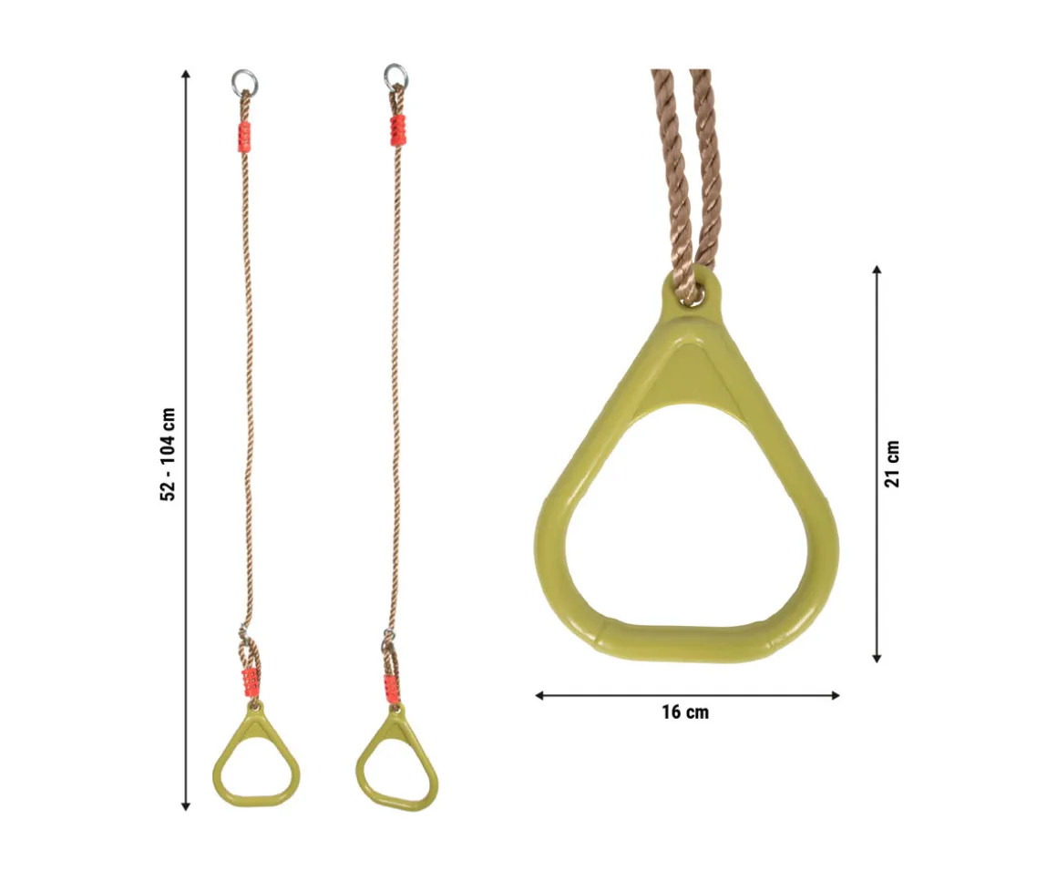 Fabricadas con plástico resistente y duradero, estas anillas están diseñadas para soportar hasta 100 kg de peso y pueden utilizarse tanto en interiores como en exteriores. Sus cuerdas ajustables en longitud permiten adaptar la altura a cada usuario, ofreciendo la máxima seguridad y comodidad durante el uso.