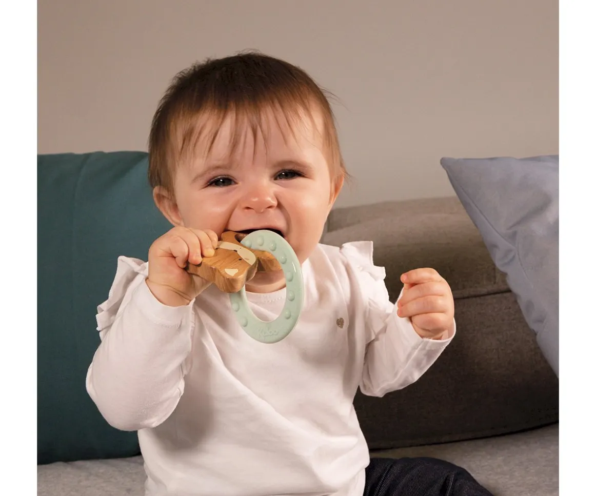 Aro de dentición de silicona decorado con una pequeña cabeza de zorro de madera. Es perfecto para aliviar el dolor de las encías del bebé. Sus colores suaves y mezcla de materiales que combinan la suavidad de la silicona y la nobleza de la madera despertarán y estimularán los sentidos tu peque