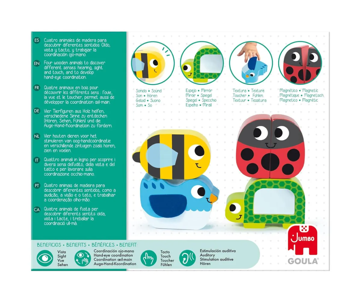 Goula presenta este set de cuatro animales de madera diseñados para que los niños descubran diferentes sentidos mientras juegan: oído, vista y tacto. Cada animal ofrece una propuesta sensorial distinta, despertando la curiosidad natural de los pequeños y animándolos a explorar el mundo que les rodea.