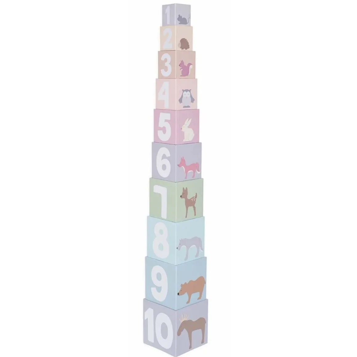 Un completo juego de cubos que alterna el equilibrio para conseguir apilarlos sin que se caigan junto con la posibilidad de aprender la numeración ya que aparecen dibujados en cada uno de ellos.
