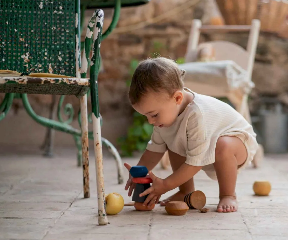A los peques les encantará apilar una y otra vez, realizando variadas combinaciones las 8 piezas de madera de diferentes colores y formas de Grapat.