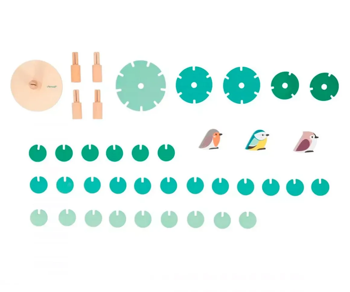 Con este juego de 37 piezas los peques podrán construir un precioso arból de 30cm. Se empieza por poner los distintos niveles del árbol en el tronco central y luego se van encajando las hojas redonditas para ver cómo se va formando el árbol como en primavera. ¿Pero qué sería de este árbol tan genial sin sus habitantes? ¡Como en la naturaleza todos conviven, pueden refugiarse en él 3 preciosos pájaros! ¡Un gorrión, un petirrojo y un herrerillo podrán posarse en lo alto de su copa! Diseñado en colaboración con WWF®. A través de esta colección Janod quiere inspirar y concienciar a las generaciones más jóvenes a favor de la fauna y la naturaleza.