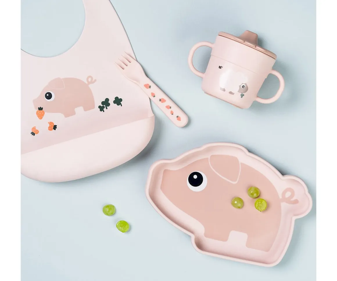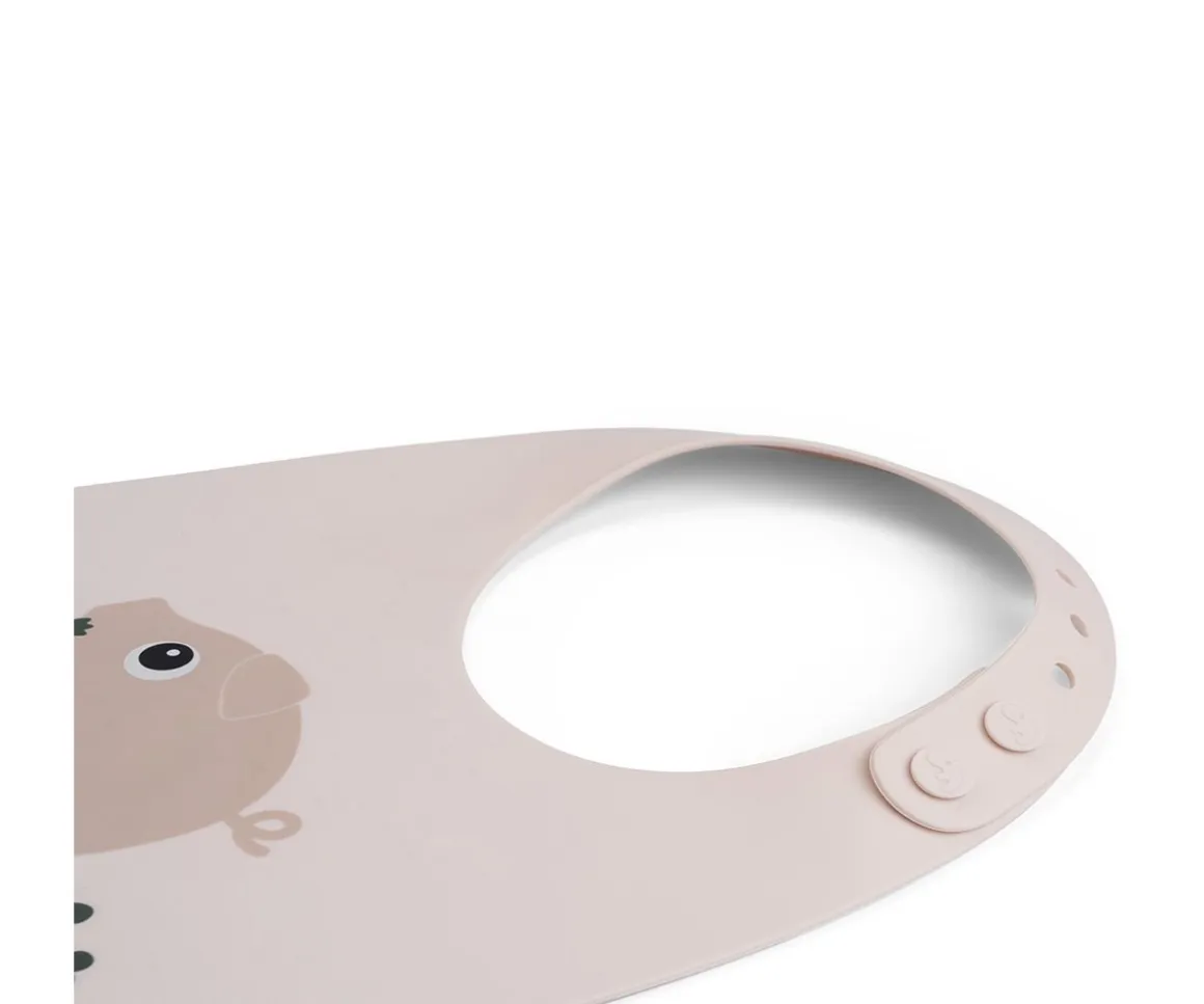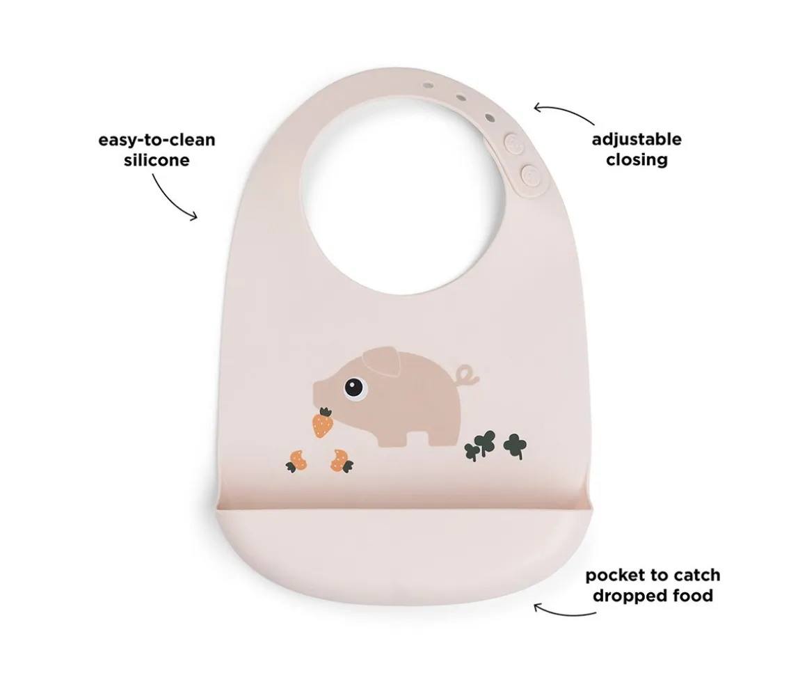 Con el babero de silicona del cerdito Pigee de la colección Tiny Farm de Done by Deer, el peque irá protegido y fácil de usar en las comidas.