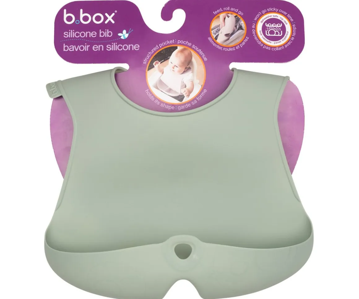 Babero práctico y enrollable de B.Box, cuenta con un bolsillo recogemigas, manteniendo al bebé más limpio, seco y cómodo durante las comidas.