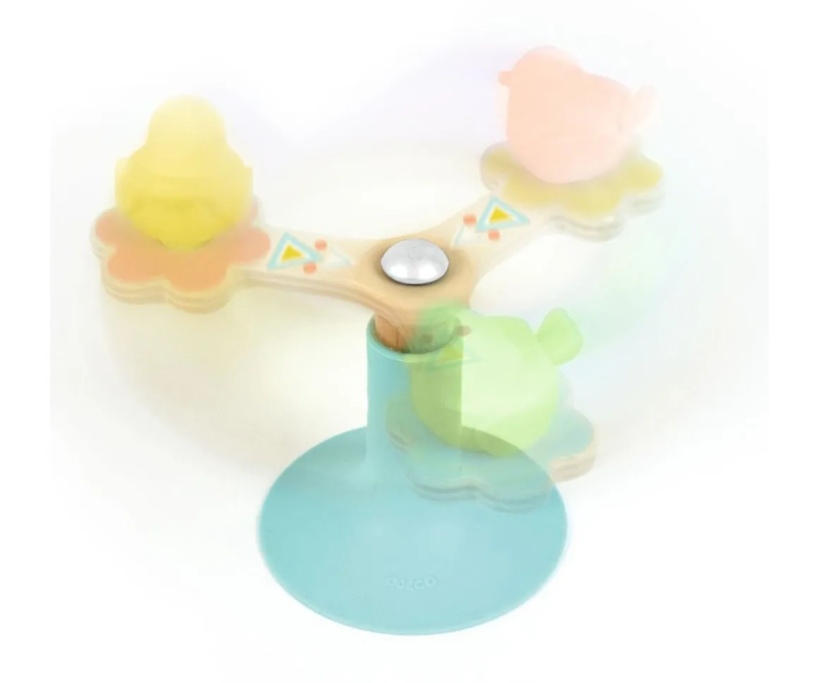 Con este juguete fabricado en madera natural y silicona tu peque tendrá el juguete perfecto para desarrollar su motricidad gracias a su sistema giratorio y sus colores pastel. Tiene una rotación suave y prolongada y se adhiere perfectamente con su ventosa de silicona a cualquier superficie lisa.