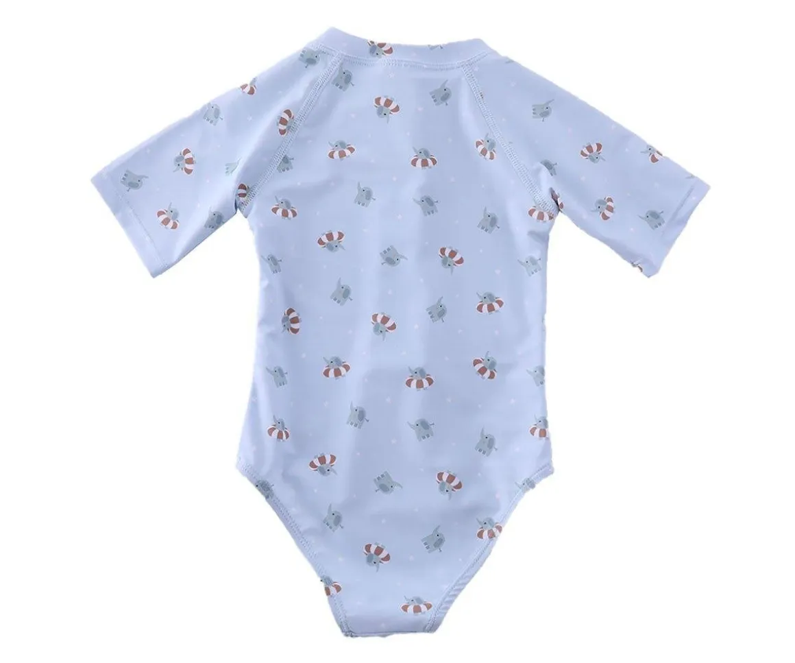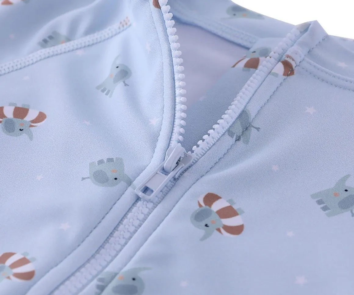Bañador con cremallera delantera de la colección Baby Elephant de Monnëka que ha sido creado con una tela especial que protege a la piel de los rayos solares