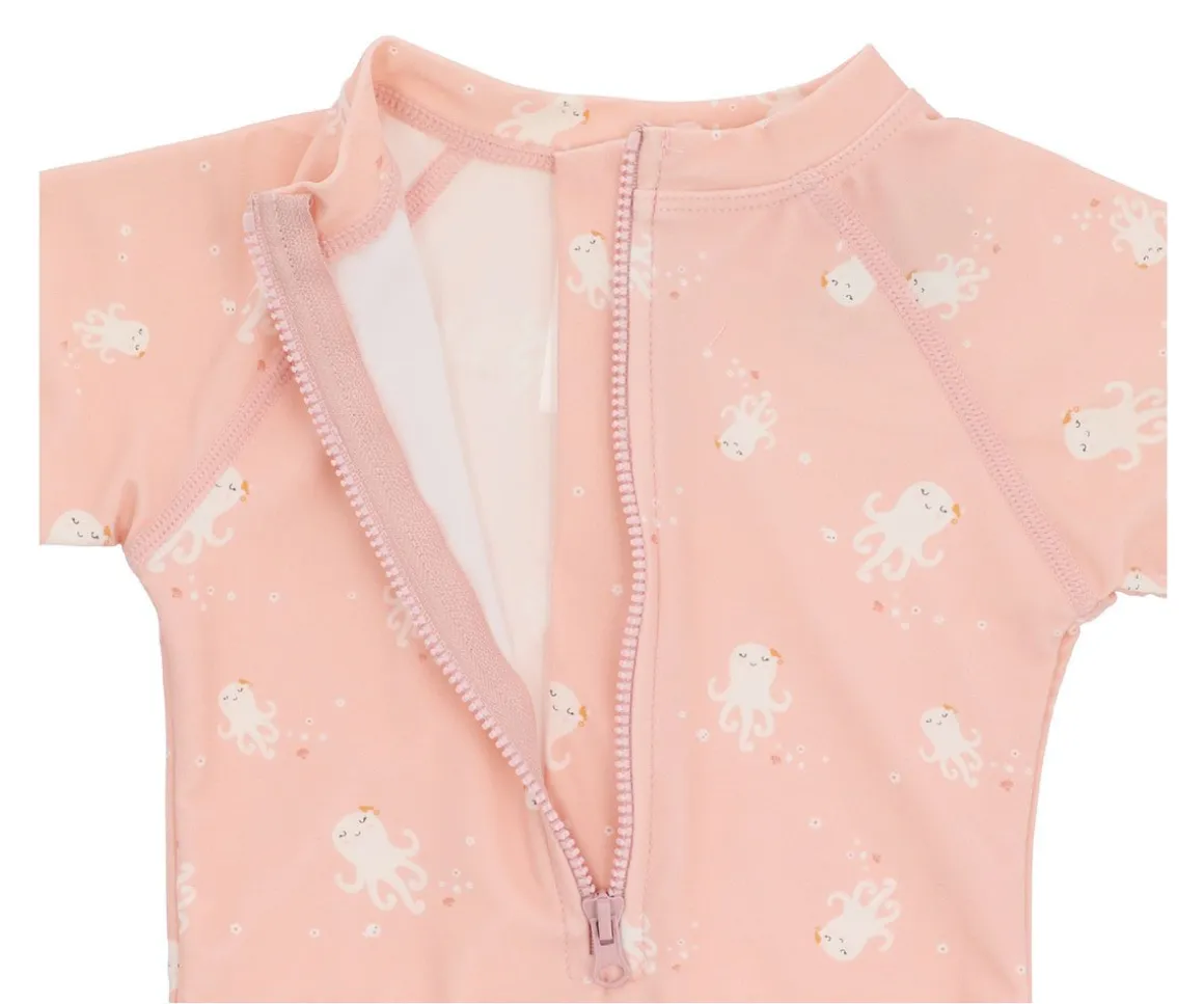 Bañador con cremallera delantera de la colección Jolie The Octopus de Monnëka que ha sido creado con una tela especial que protege a la piel de los rayos solares