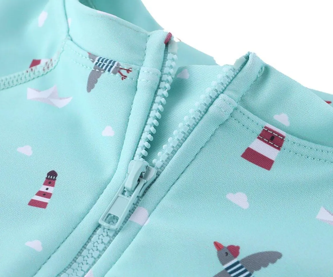 Bañador con cremallera delantera de la colección Lighthouse de Monnëka que ha sido creado con una tela especial que protege a la piel de los rayos solares