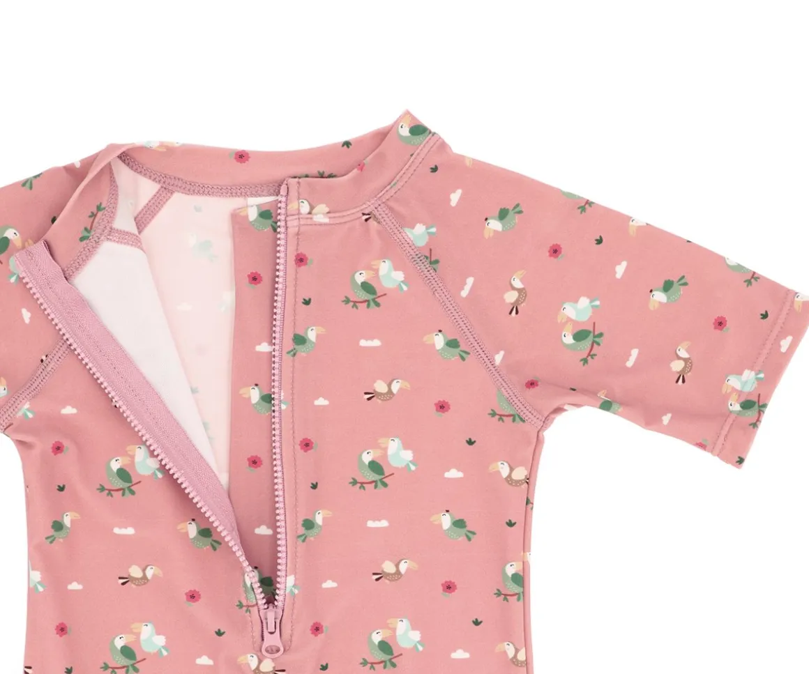Los bañadores con cremallera delantera y preciosos estampados de las colecciones Verano Monnëka 2025 han sido confeccionados con una tela especial que protege la piel de los peques de los rayos solares.