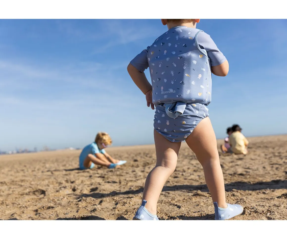 Bañador pañal de la colección Crab Sage de Monnëka que ha sido creado con una tela especial que protege a la piel de los rayos solares además que evita fugas sólidas cuando el peque se está bañañdo en la playa o la piscina.