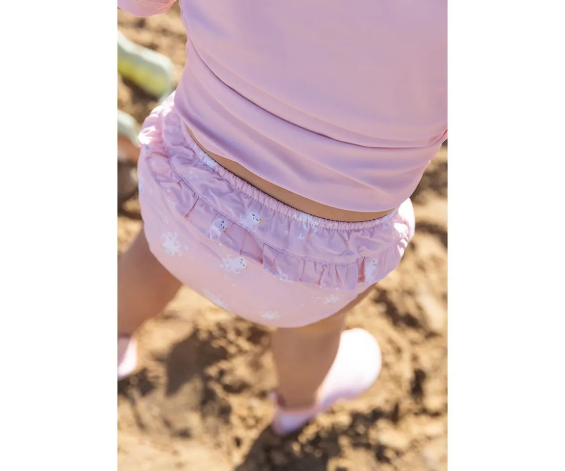 Bañador pañal de la colección Crab Coral de Monnëka que ha sido creado con una tela especial que protege a la piel de los rayos solares además que evita fugas sólidas cuando el peque se está bañañdo en la playa o la piscina.
