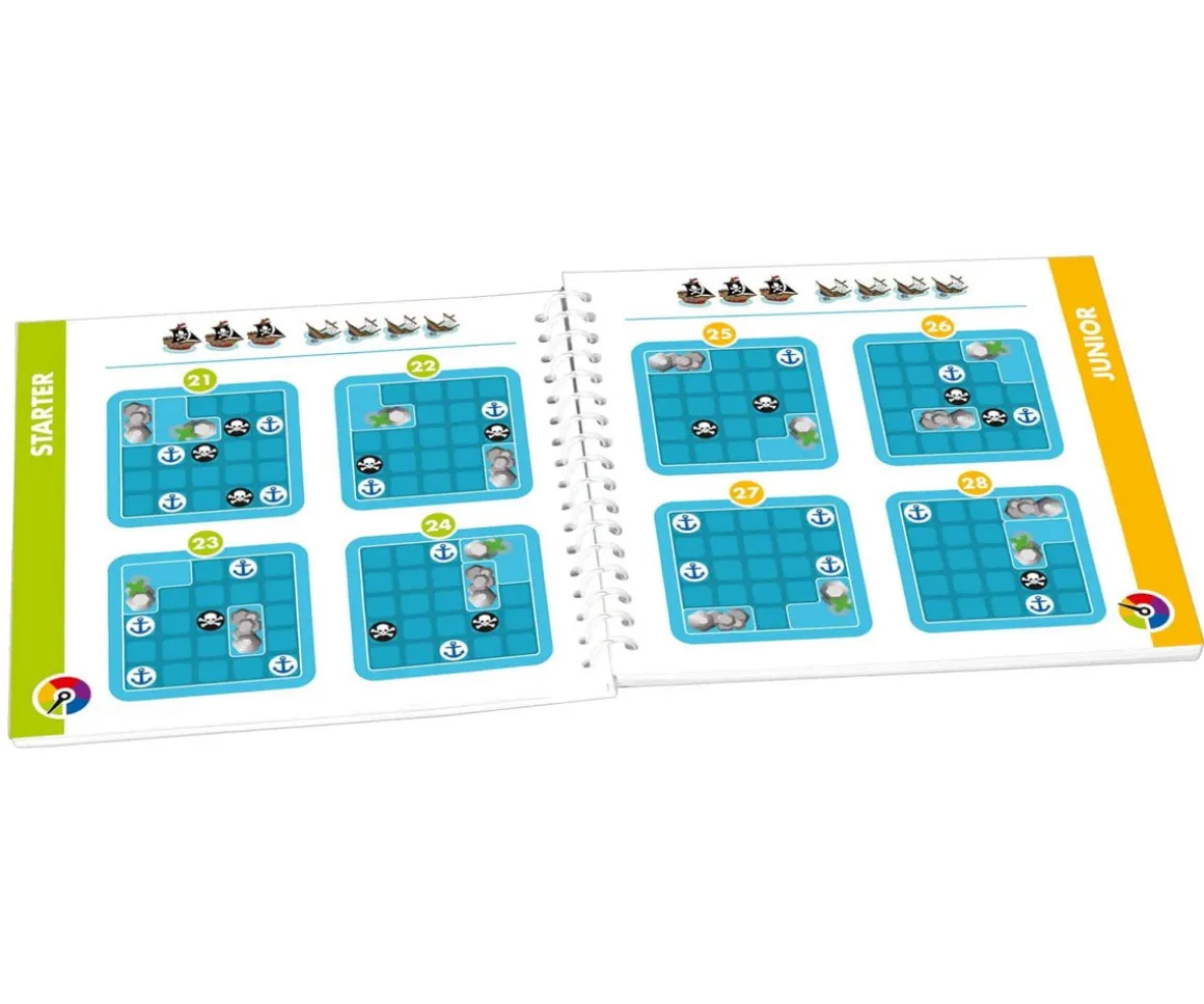 - 1 tablero de juego, dos fichas de barco pirata, 4 fichas de navío, 1 libro de retos