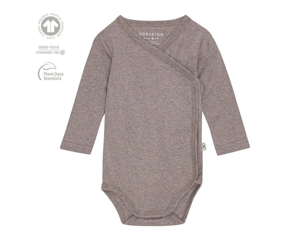 Body con manga larga de algodón orgánico teñido con plantas y libre de químicos que presenta un diseño cruzado con dos botones a presión en ambos lados. En la parte inferior se cierra con botones a presión.