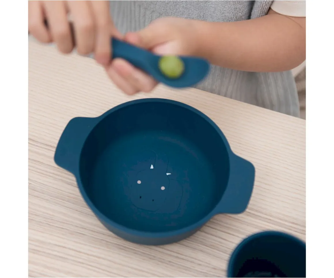 Bol de silicona con asas anchas útiles para que los peques comiencen a sostenerlo ellos mismos. Disfrutarán descubriendo su rostro amistoso en el fondo del bol. Los cuencos se pueden apilar bien para un fácil almacenamiento