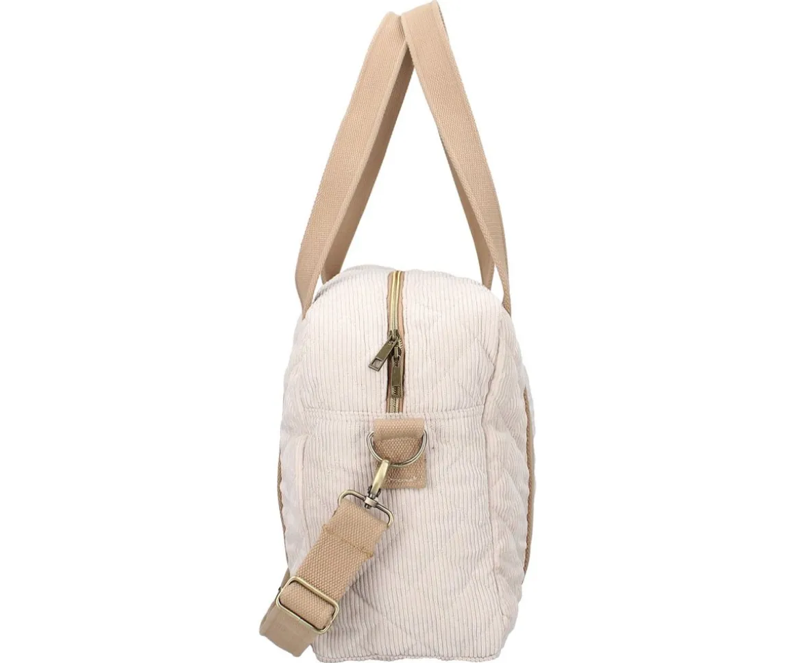 Confeccionada en tejido acanalado y de color beige cuenta con un espacioso compartimento principal con cierre con cremallera, una correa larga para el hombro ajustable, que también puedes usar para rodear el carrito de tu bebé.En la parte superior cuenta con 2 asas cortas, un bolsillo en la parte delantera y un bolsillo con cremallera en la parte posterior para pequeños objetos.