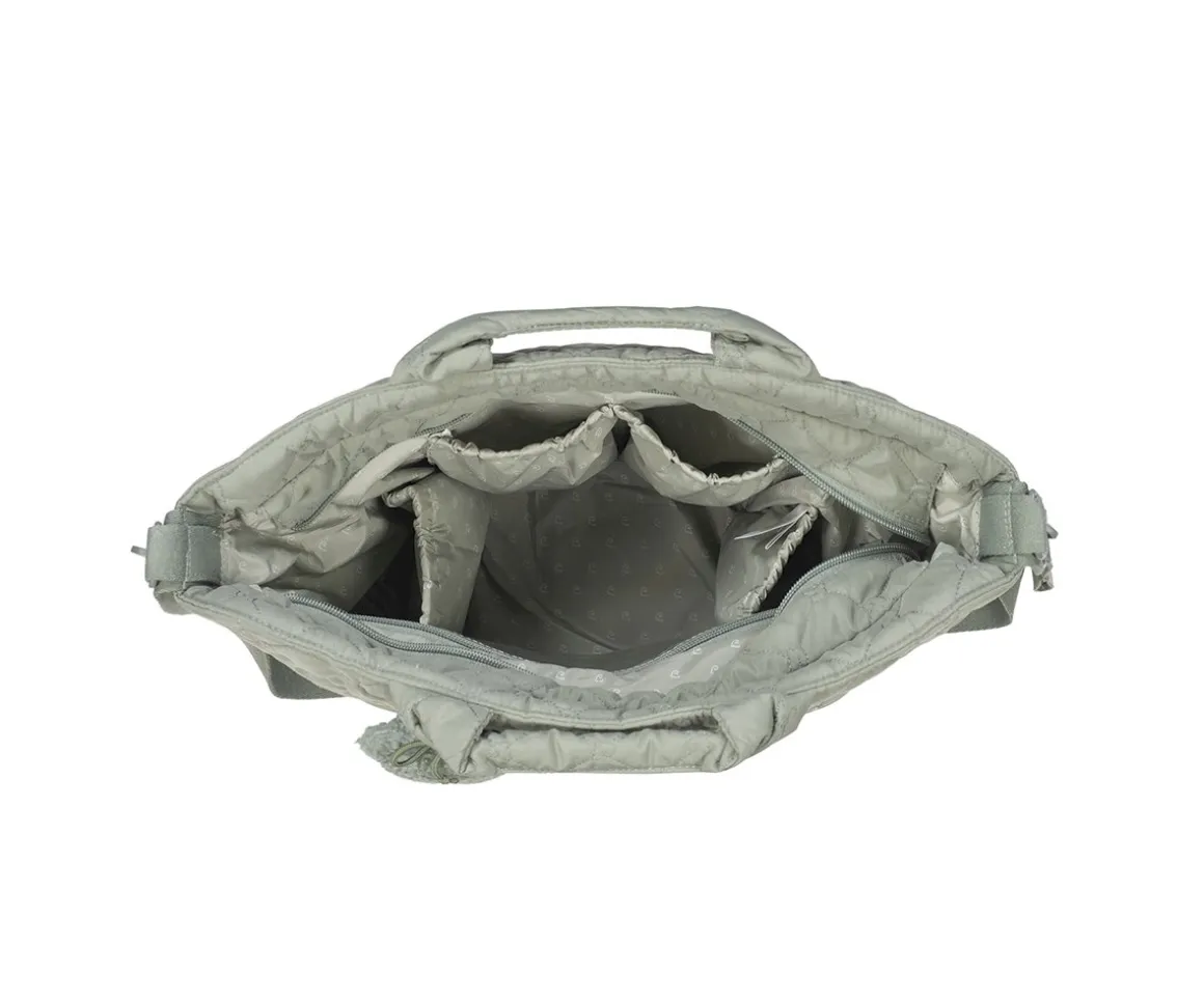 Viene equipado con doble asa, una larga para colgar en el hombro y unas cortas de mano. Incluye asas adicionales universales para colgarla al cochecito.