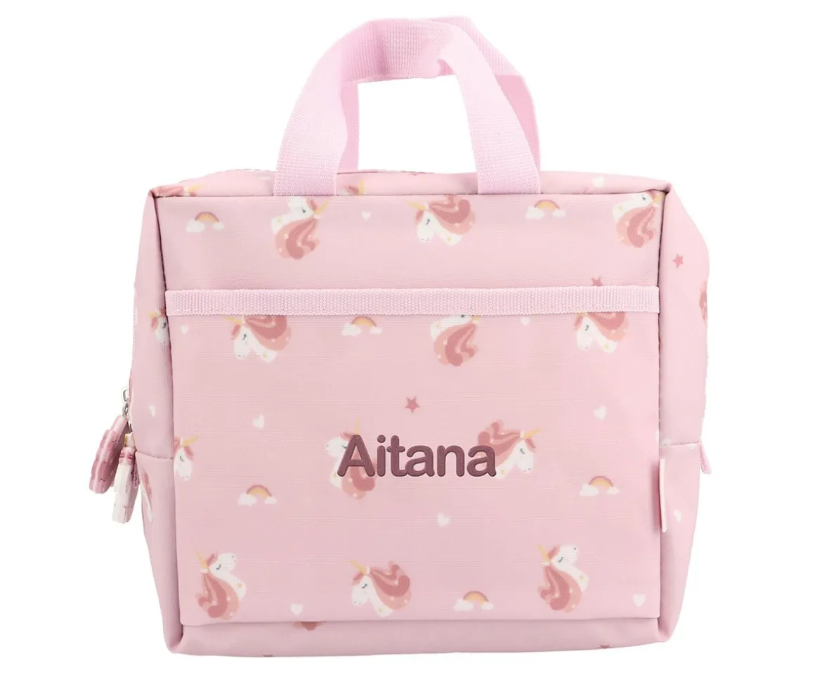 Tiene 2 asas cortas, para fácil transporte, y un bolsillito exterior donde puedes guardar cubiertos o pequeños objetos que necesites tener más a mano, que se puede personalizar con el nombre.