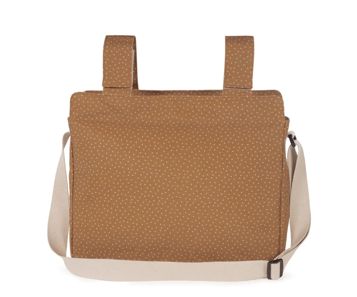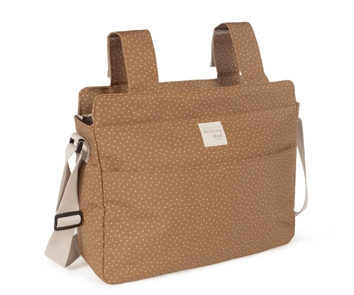 El bolso organizador de lunares Poppy Canela de Walking Mum para el cochecito es espaciosa y duradera, con múltiples bolsillos para organizar todo lo necesario para tu bebé. Incluye un cambiador y cuenta con bolsillos para ropa mojada y botellas o termos. Con un sistema de sujeción universal y correas ajustables, es fácil de llevar y de sujetar a la silla de paseo.