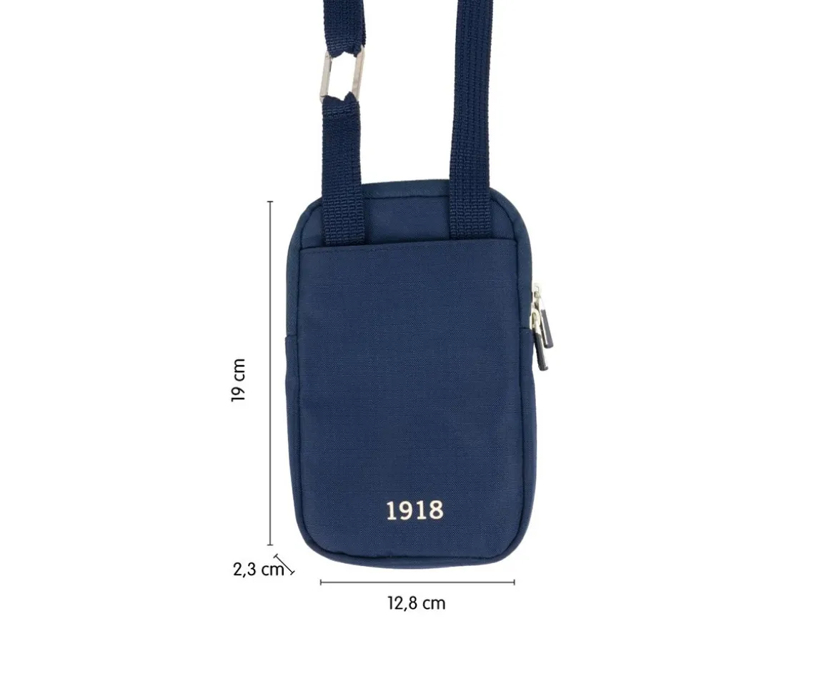 Bolso bandolera de tela de color azul marino con una asa regulable para llevar al hombro o cruzado. Ideal para llevar el móvil y lo imprescindible. Cuenta con un compartimento principal con cierre mediante cremallera que incluye un bolsillo interior y un pequeño mosquetón para llaves. Tiene dos bolsillos exteriores.