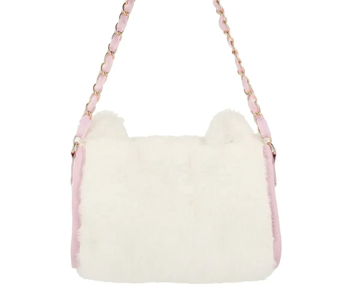 Bolso muy suave y elegante de gato con carita bordada confeccionado con tela de felpa suave, con una correa de cadena de metal en tono dorado con cinta de raso naranja ensartada.
