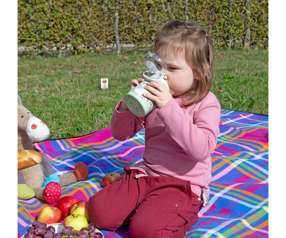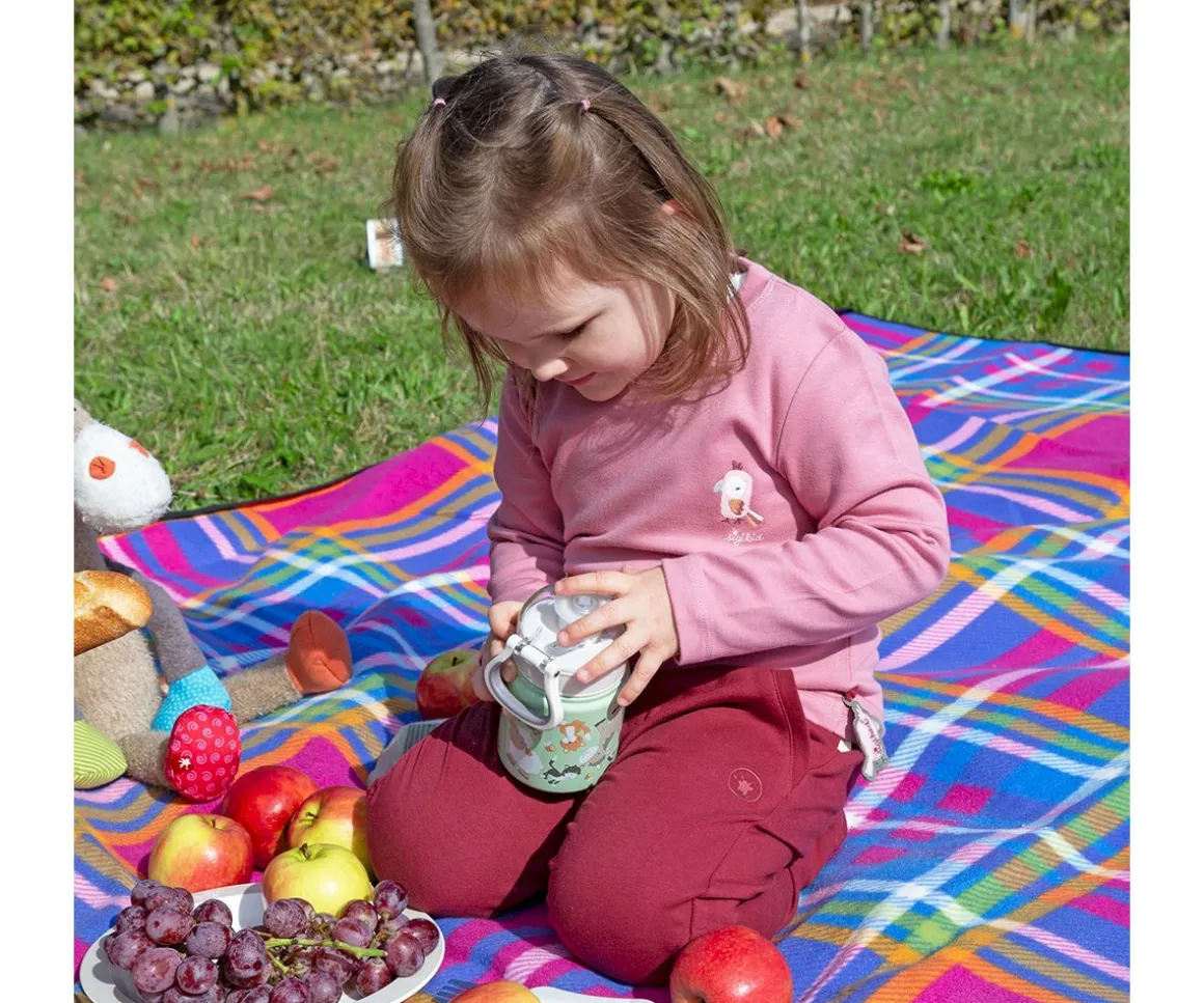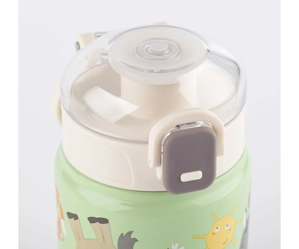 Botella de acero inoxidable con capacidad de 400 ml y estampado con los divertidos animalitos de la granja de Sigikid. Ideal para el colegio o excursiones, fácil de abrir y con tapón deportivo para un uso cómodo para los peques.