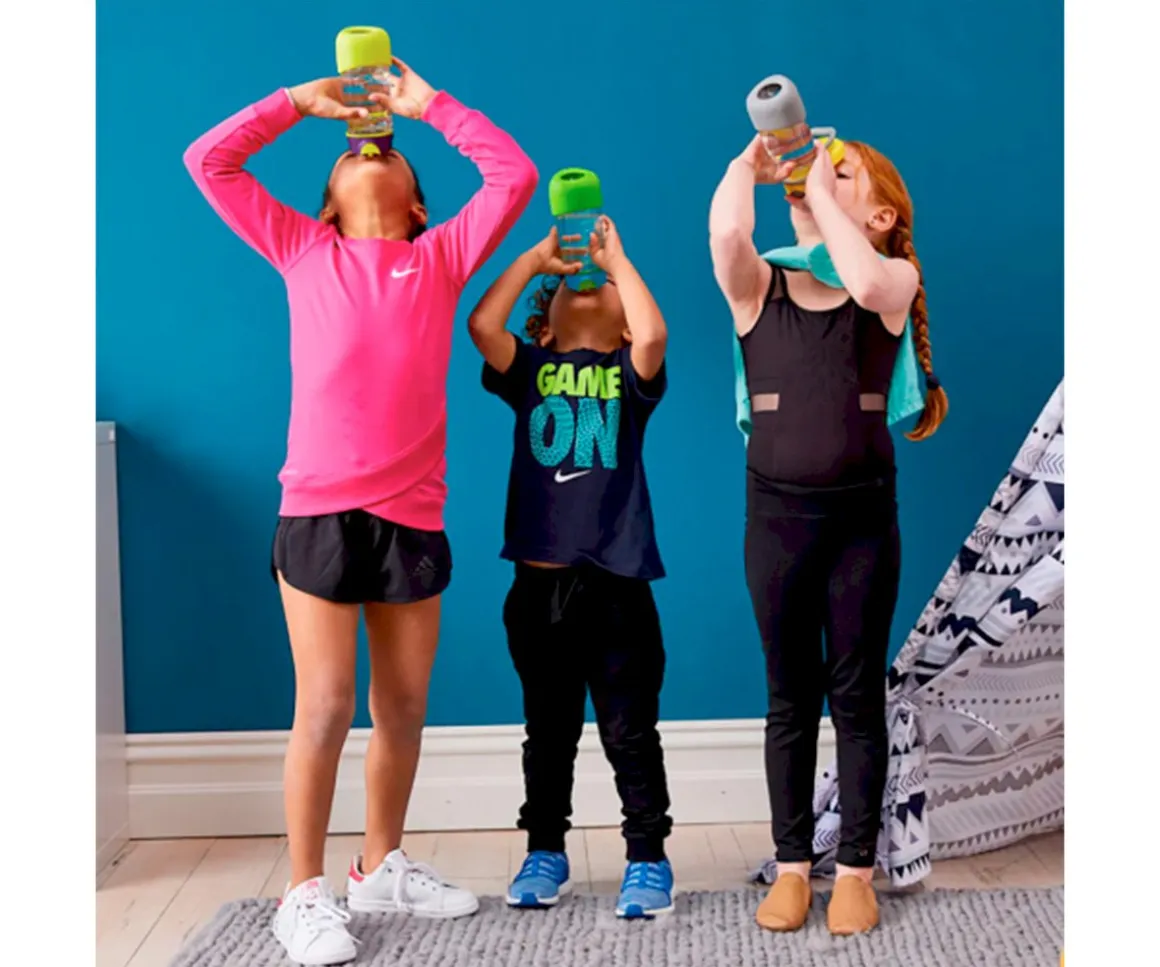 El botón pulsador grande y la tapa abatible hacen que sea fácil para abrir y beber, además una vez cerrada, es a prueba de fugas. El asa flexible permite que los niños la lleven cómodamente. Además, cuenta con una base extraíble para protegerla contra los golpes. Fabricada en tritán, la botella es liviana y muy duradera.